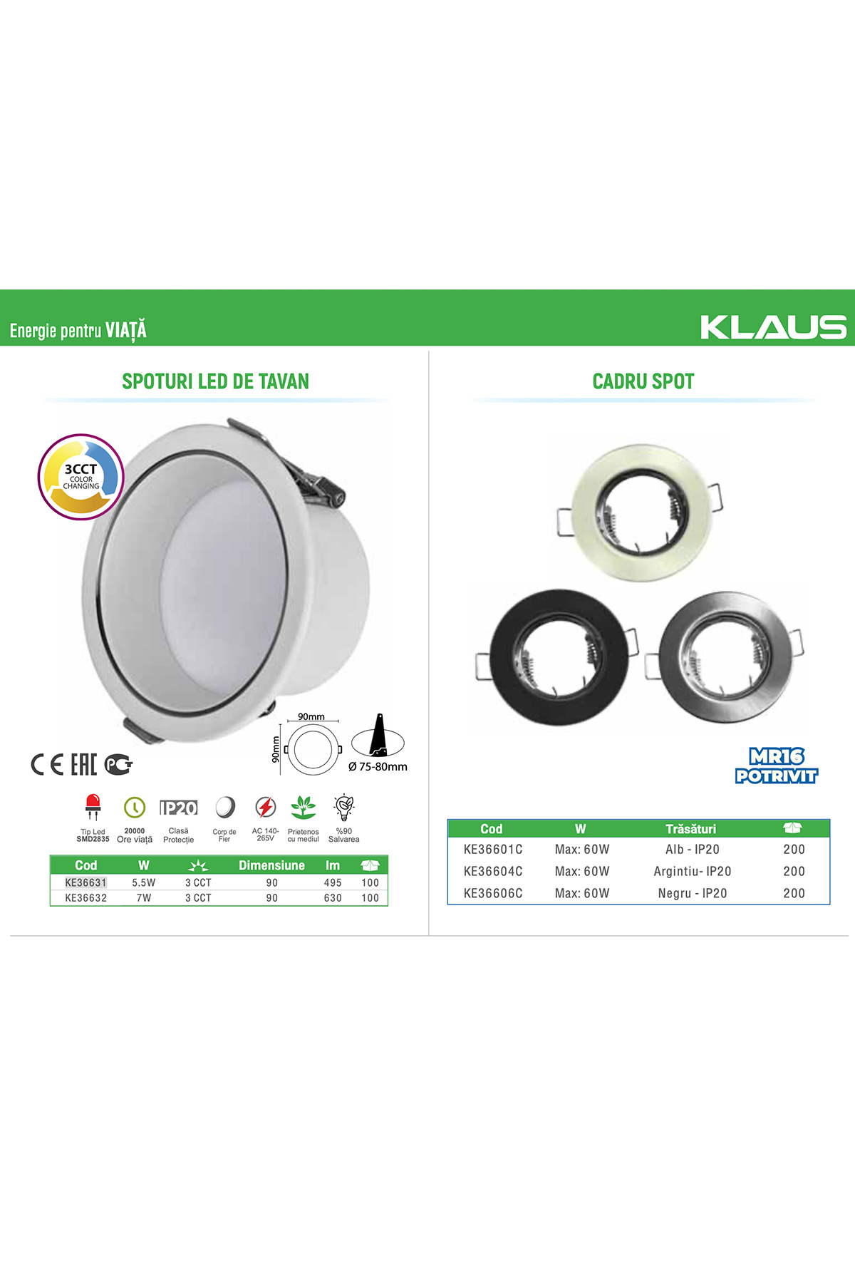 Orice bec LED cu soclu GU5.3 (MR16). Recomandăm Klaus MR16 5W (400 lm) sau 7W (540 lm). Alegeți temperatura: 3000K cald, 4000K neutru, 6500K rece. Becurile nu sunt incluse.