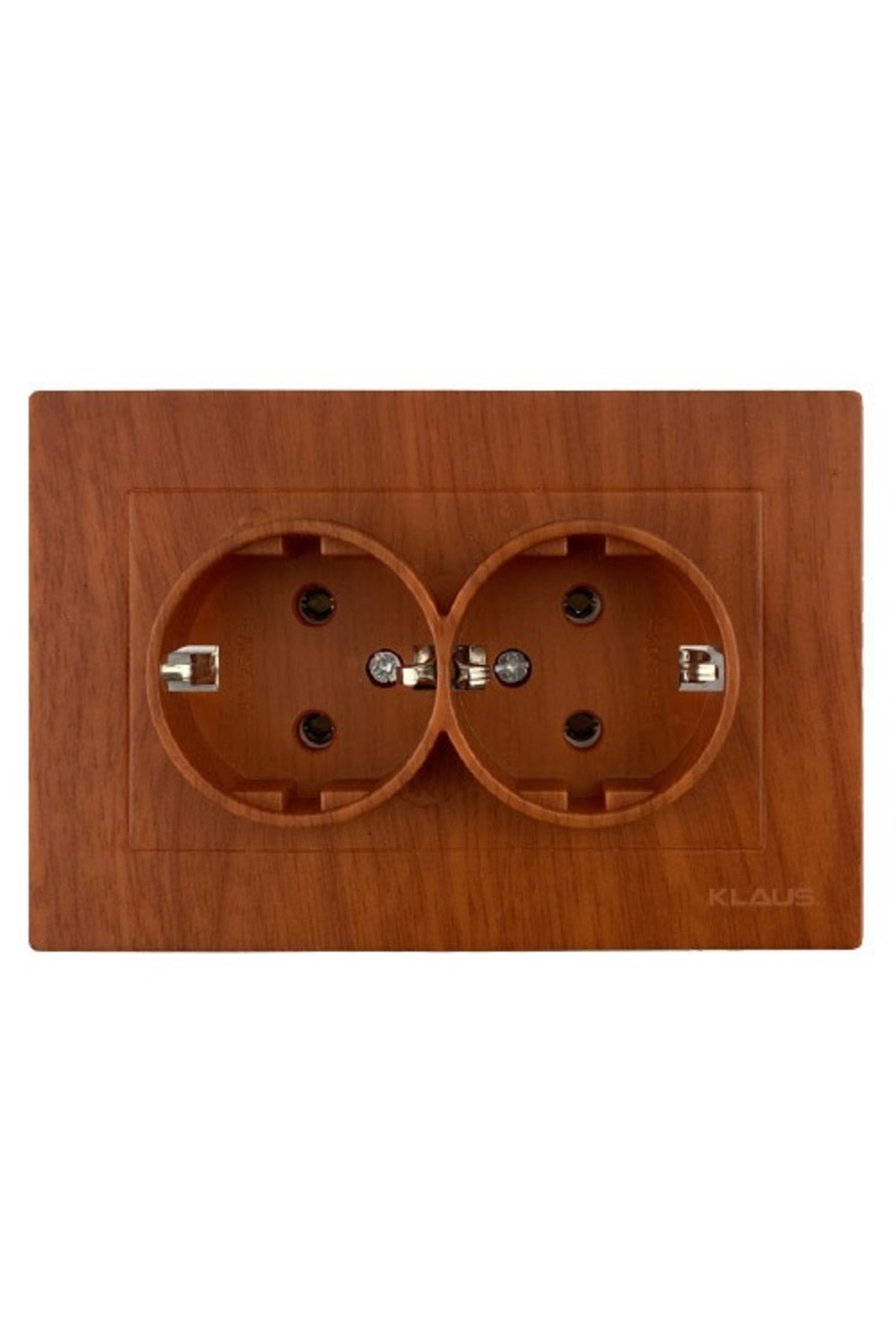 Set 6 priză dubla Schuko Klaus, finisaj efect lemn, 16A/250V~ AC. Doua prize Schuko cu contact de împământare intr-un singur corp. Fiecare priză suporta 16A/250V~ independent. Permite conectarea simultana a doua aparate electrice fara multiplu/prelungitor. Montaj in doza standard O60 mm, montaj ingropat (flush) in perete. Cleme cu șurub. Material: policarbonat ignifug. Conform EN 60884-1.