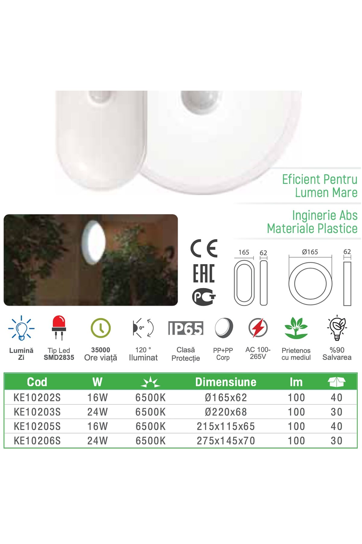Senzorul de miscare integrat elimina nevoia de întrerupător – lumina se aprinde automat cand treci prin zona si se stinge singura. Economie de energie semnificativa: funcționează doar cand este nevoie, nu ramane aprinsa toata noaptea. IP65 permite montaj exterior (intrari, terase, scari, garaje) unde mainile sunt ocupate si nu poti actiona întrerupătorul.