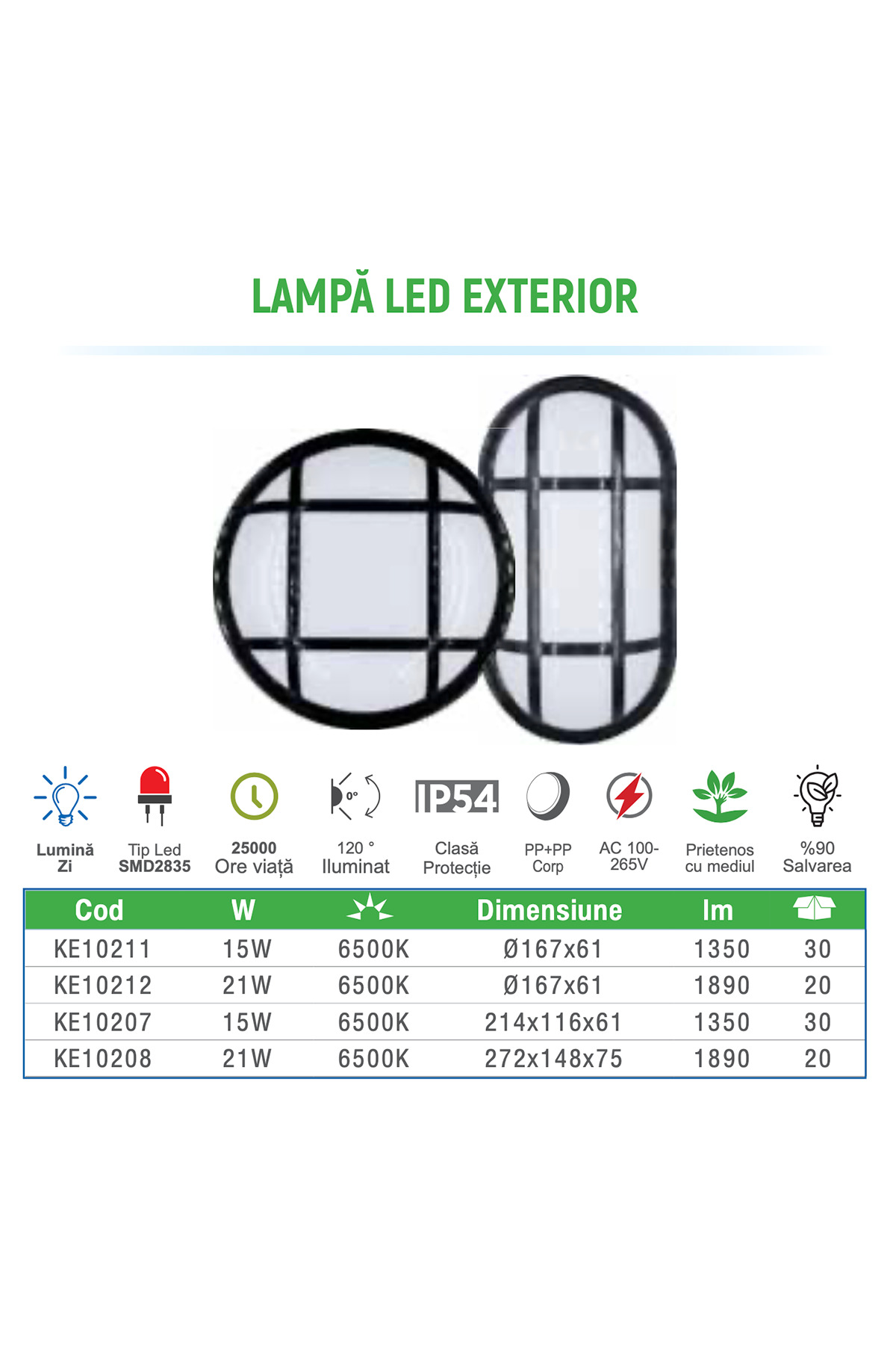 Aplica ovala IP54 funcționează atat in exterior (terase, intrari, scari) cat si in interior (bai, coridoare). IP54 protejeaza complet la praf si la stropire apa. La 15W si 90 lm/W, ofera 1350 lumeni – suficient pentru iluminatul unei zone de 8-12 m2. Dungile decorative difuzeaza lumina creand un efect vizual distinctiv pe perete.