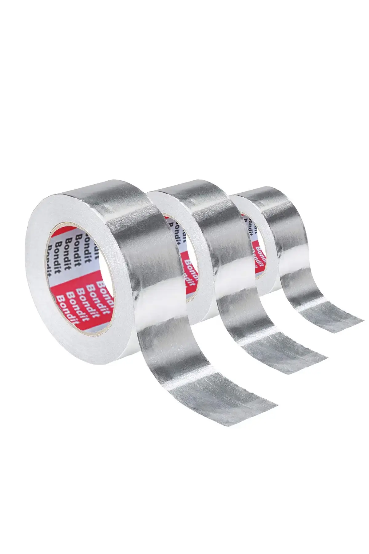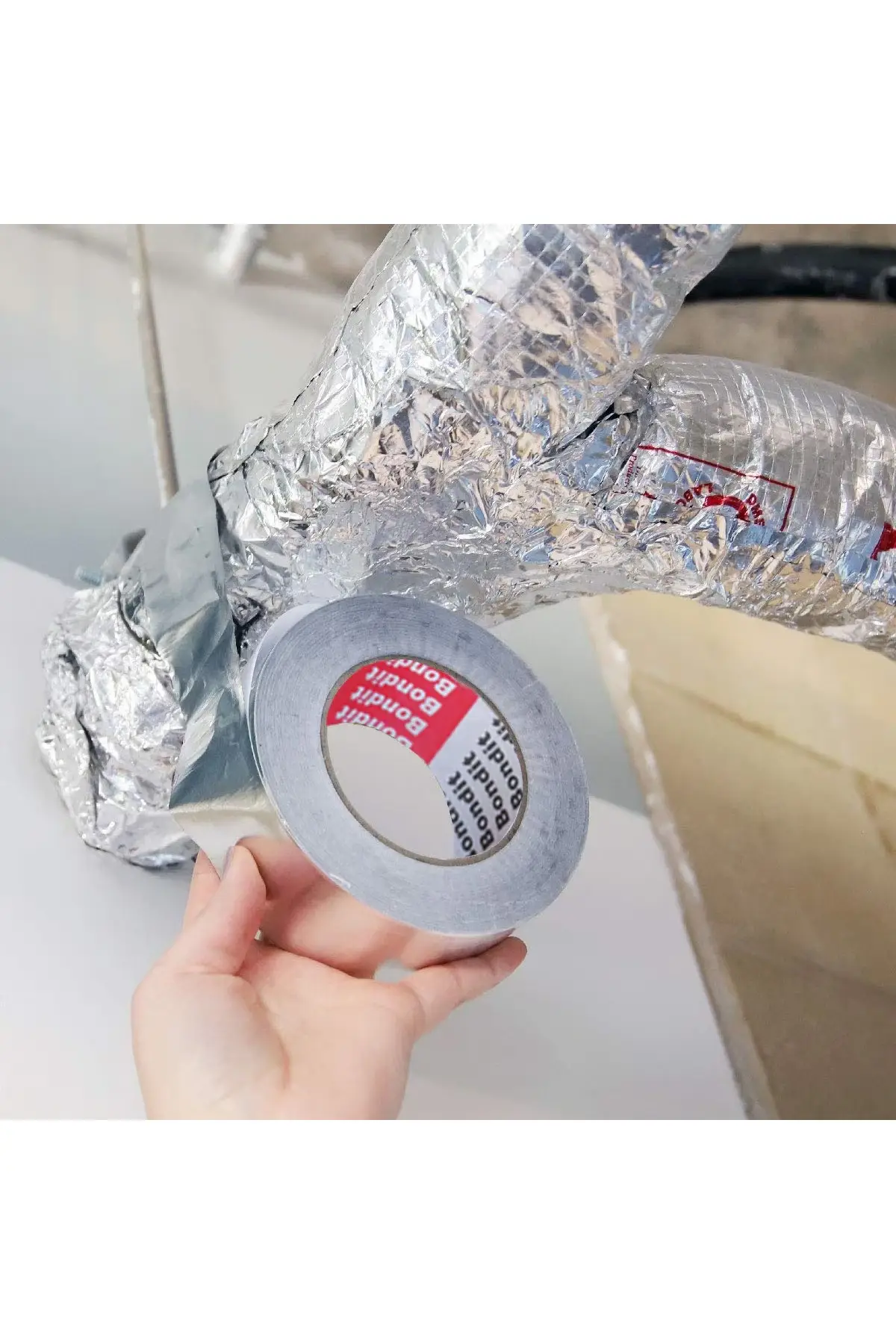 Bandă adezivă din aluminiu Bondit, 48 mm × 15 m. Format compact pentru reparații punctuale și izolații la conducte de ventilație, țevi de apă caldă și canale HVAC.