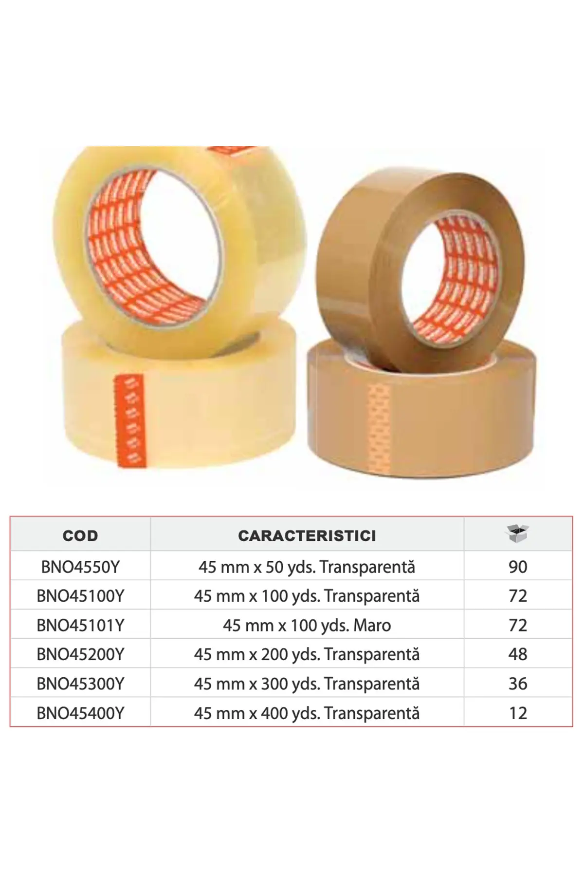 Bandă Orient de ambalare transparent, lățime standard 45 mm, lungime 300 yard (273 metri per rolă). Adeziv acrilic cu aderență puternică pe carton, plastic și hârtie — standard pentru ambalare colete, depozitare și mutări.