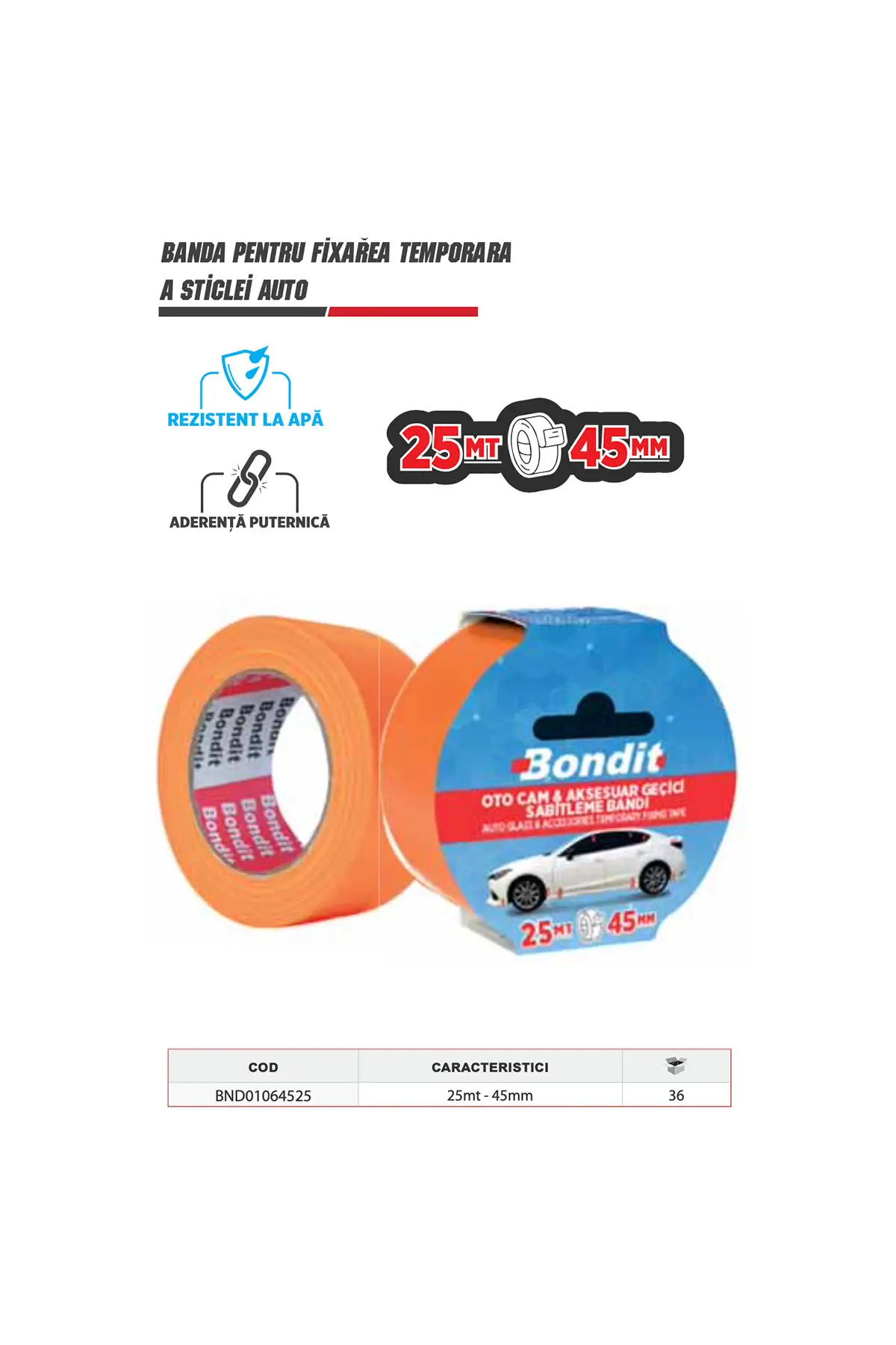 Bandă de fixare temporară Bondit, 45 mm × 25 m, pentru geamuri auto și accesorii. Se dezlipește curat fără resturi de adeziv. Transparentă, rezistentă la vânt și vibrații.