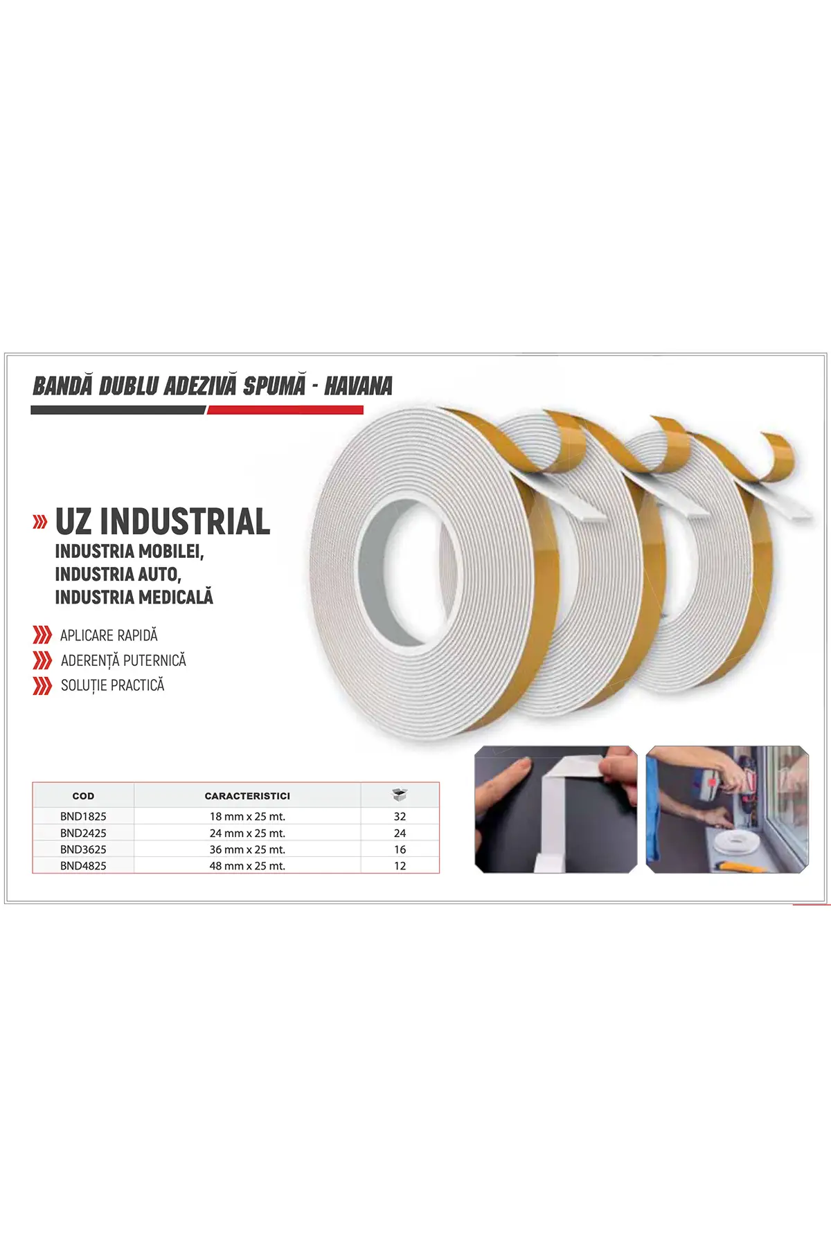 Bandă dublu adezivă Bondit cu suport din spumă, 36 mm × 25 m, culoare Havana. Bandă lată pentru montaj panouri grele și profile late în producția industrială de mobilier și amenajări.