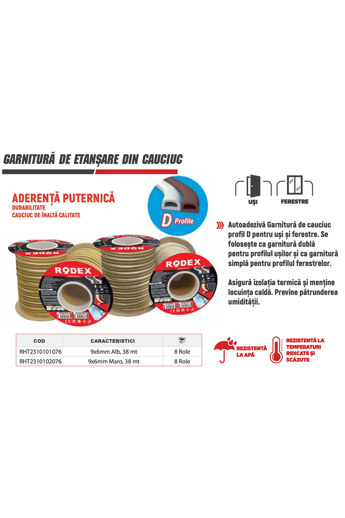 Bandă de etanșare autoadezivă din cauciuc, profil D (9×6 mm), 2×38 m. Se aplică pe rame de uși și ferestre pentru eliminarea curenților de aer și reducerea zgomotului. Profil D: compresibilitate optimă pentru goluri de 3-7 mm.