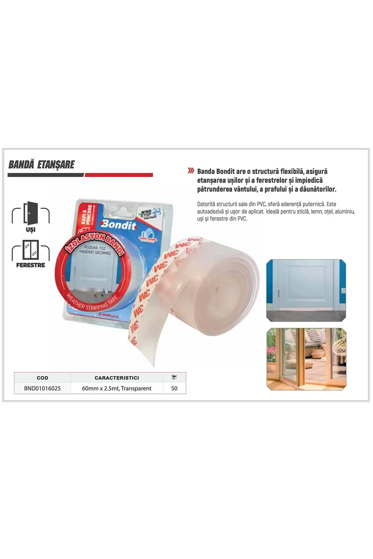 Bandă izolantă autoadezivă transparentă Bondit, 60 mm × 2,5 m, pentru etanșarea ușilor și ferestrelor. Oprește curentul de aer, praful și insectele mici. Invizibilă după aplicare.
