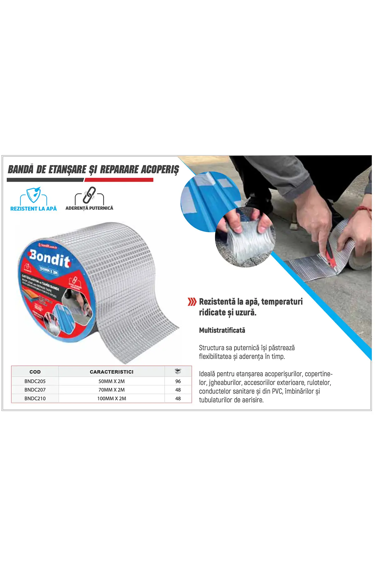 Bandă de reparații Bondit pentru acoperișuri, 50 mm × 2 m × 1 mm. Sigilează scurgeri, fisuri și joncțiuni deteriorate. Impermeabilă, rezistentă la UV, ploaie și variații de temperatură.