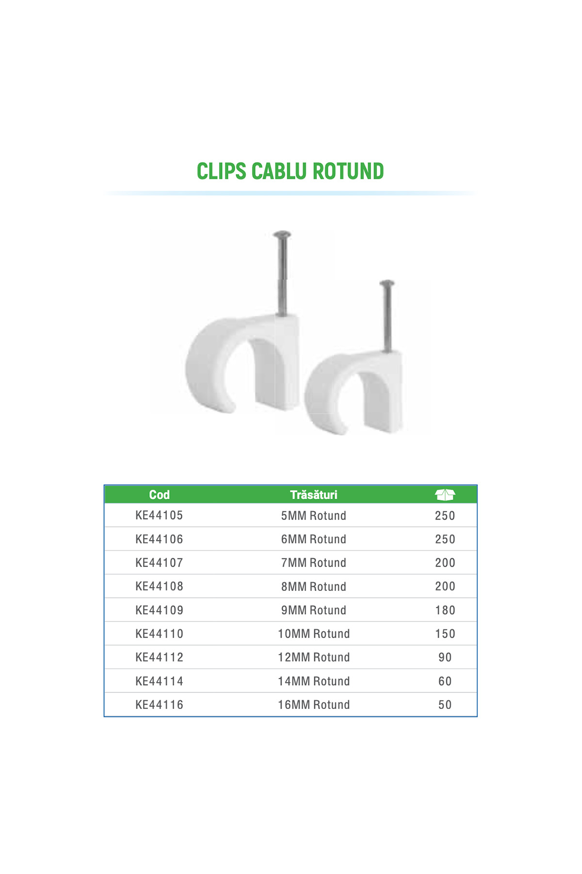 Set 100 cleme rotunda Klaus pentru fixare cabluri cu diametru 14 mm, cu cui de otel inclus. Material plastic (PE/PP) rezistent UV, cui din otel zincat. Se bat cu ciocanul in perete de beton, caramida, lemn sau rigips (cu diblu). Distanta recomandata intre cleme: 20-30 cm.