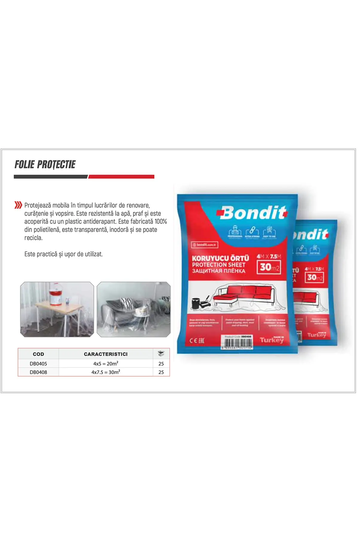 Folie de protecție transparentă Bondit, 4 × 5 m (20 m²). Acoperire pardoseală și mobilier la zugrăvire, renovare și construcții. Rezistentă la apă, vopsea și praf.
