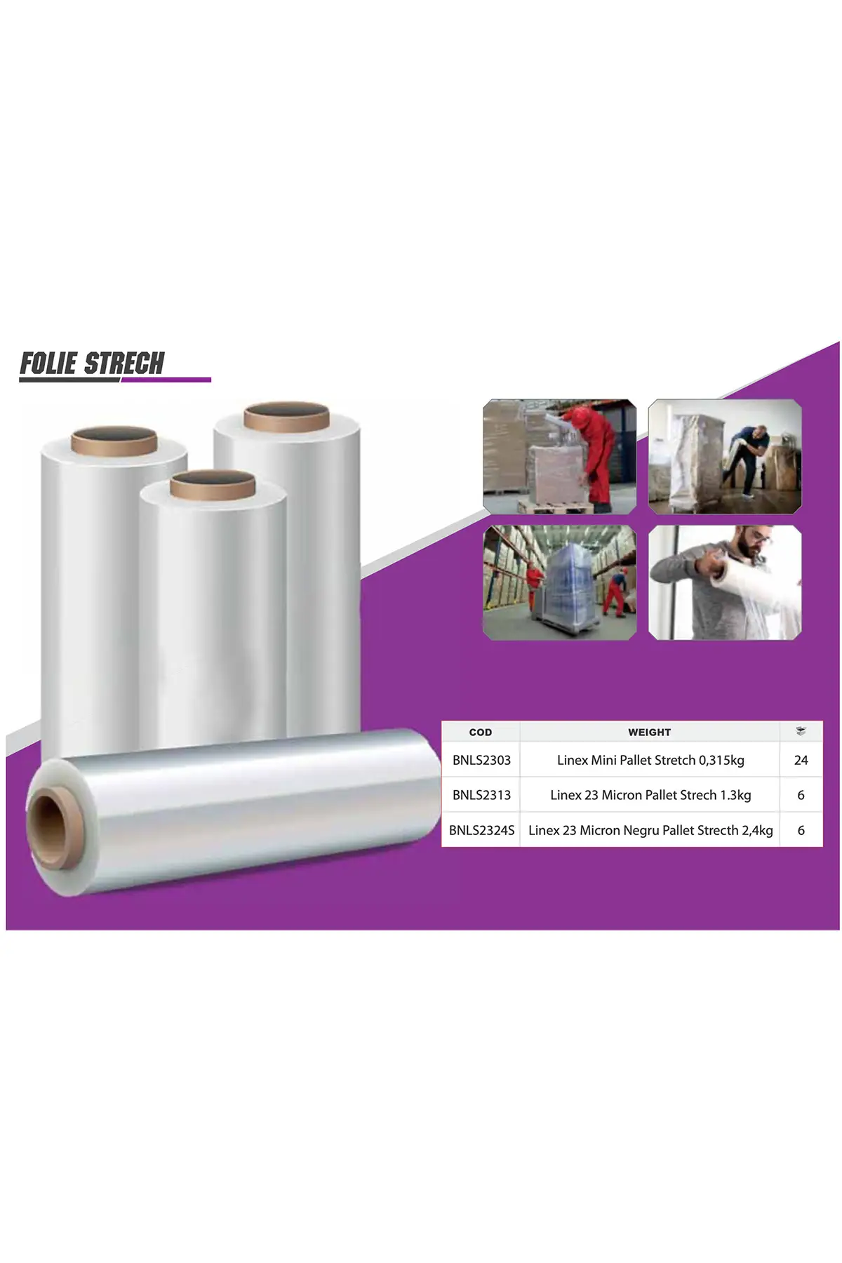 Folie stretch neagră Bondit Linex, 23 microni, rolă de 2,4 kg. Ascunde conținutul paleților pentru confidențialitate și protecție anti-furt. Format mare economic.