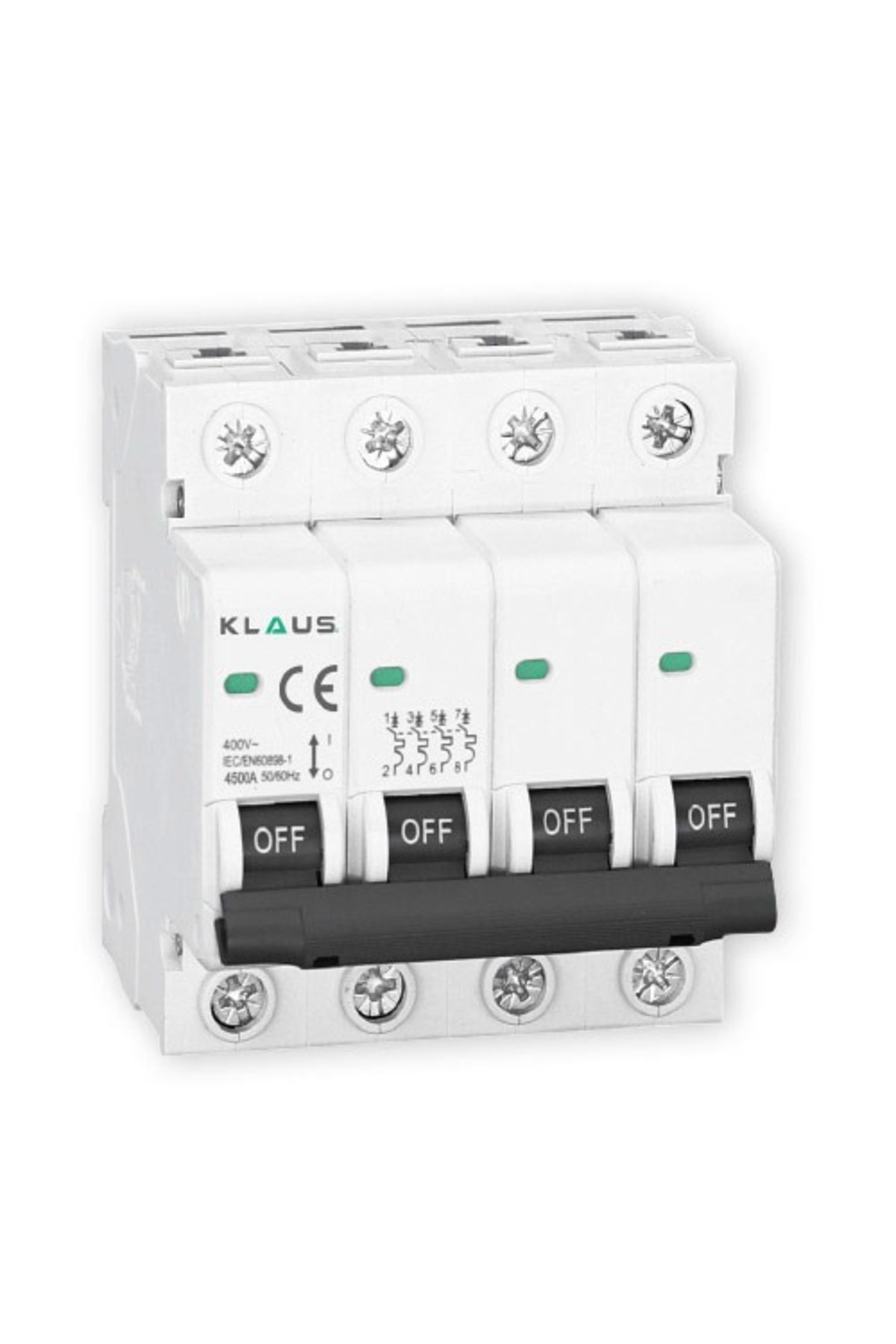 Siguranță automată MCB Klaus, 4P (4 module), 63A, capacitate de rupere 4.5 kA, curba C. Conform IEC/EN 60898-1. Declanșare termomagnetic: bimetal (suprasarcină) + bobină electromagnetică (scurtcircuit la 5-10× In). Endurabilitate mecanică: 90.000 cicluri (4,5× media industriei). Dimensiuni: 72×77 mm. Montaj pe șină DIN 35 mm (EN 60715). Cleme cu șurub superioare și inferioare.