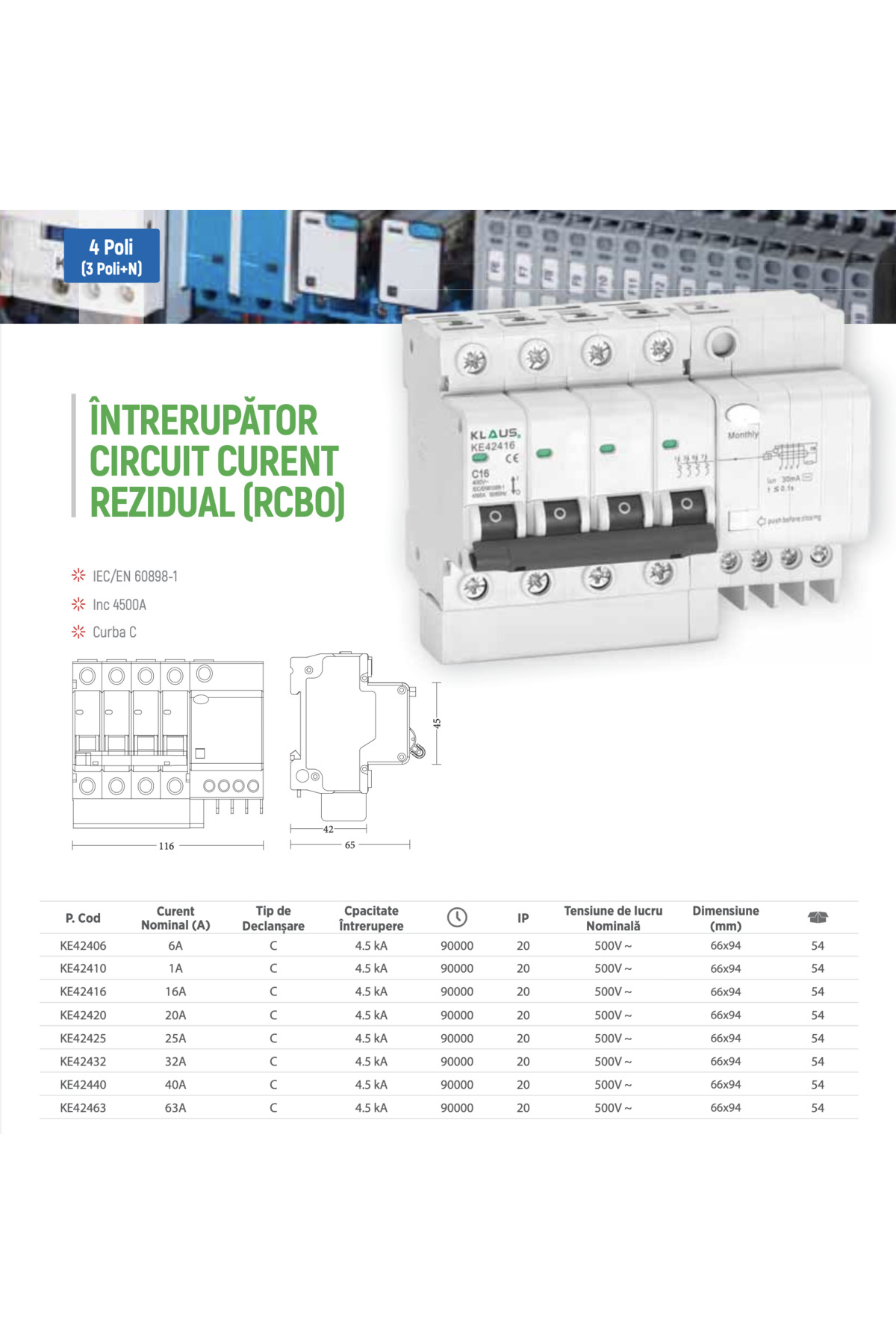 Întreruptor diferențial cu protecție la supracurent RCBO Klaus, 3P+N, 6A, sensibilitate 30 mA, capacitate de rupere 4.5 kA, curba C. Conform IEC/EN 61009. Combină funcțiile MCB (protecție supracurent/scurtcircuit) + RCCB (protecție curent rezidual) într-un singur modul compact. Ocupă 4 module pe șina DIN. Declanșare termomagnetic + detector curent rezidual. Buton de test integrat.