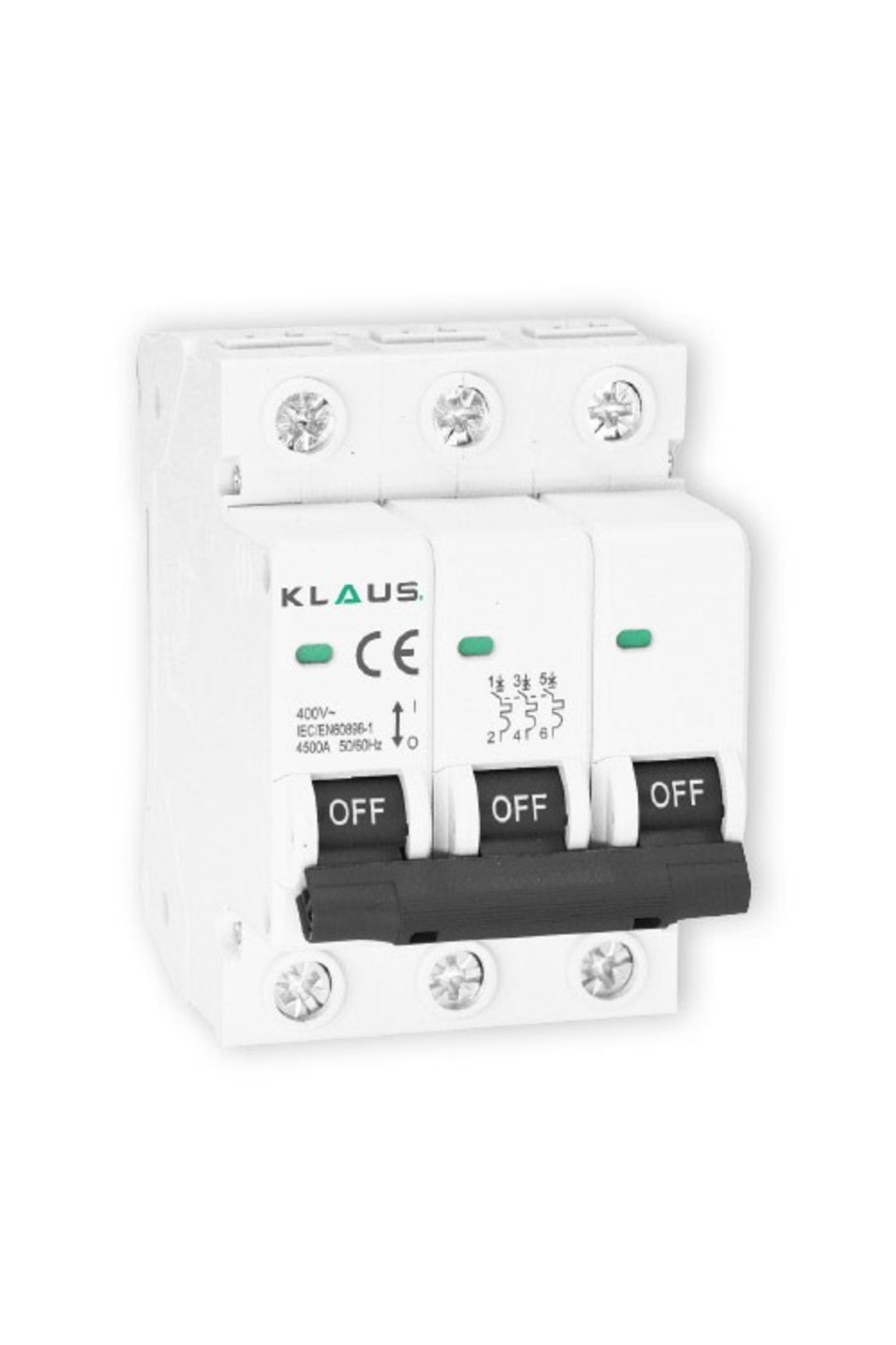 Siguranță automată MCB Klaus, 3P (3 module), 6A, capacitate de rupere 4.5 kA, curba C. Conform IEC/EN 60898-1. Declanșare termomagnetic: bimetal (suprasarcină) + bobină electromagnetică (scurtcircuit la 5-10× In). Endurabilitate mecanică: 90.000 cicluri (4,5× media industriei). Dimensiuni: 54×77 mm. Montaj pe șină DIN 35 mm (EN 60715). Cleme cu șurub superioare și inferioare.