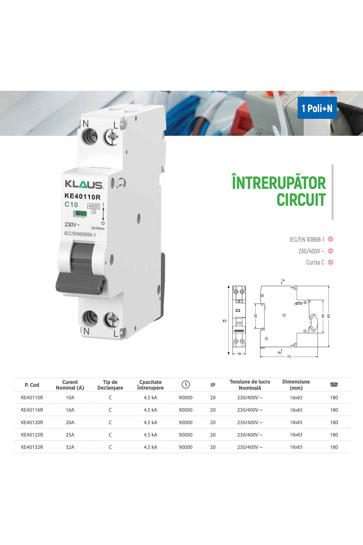 Set 6 siguranțe automate MCB Klaus, 1P+N (2 module), 20A, capacitate de rupere 4.5 kA, curba C. Conform IEC/EN 60898-1. Declanșare termomagnetic: bimetal (suprasarcină 1,13-1,45× In) + bobină electromagnetică (scurtcircuit 5-10× In). Endurabilitate mecanică excepțională: 90.000 cicluri — de 4,5× mai mult decât media industriei de 20.000 cicluri. Dimensiuni: 36×77 mm per pol. Montaj pe șină DIN 35 mm (EN 60715). Cleme cu șurub superioare și inferioare. Material: nailon armat ignifug (V0).