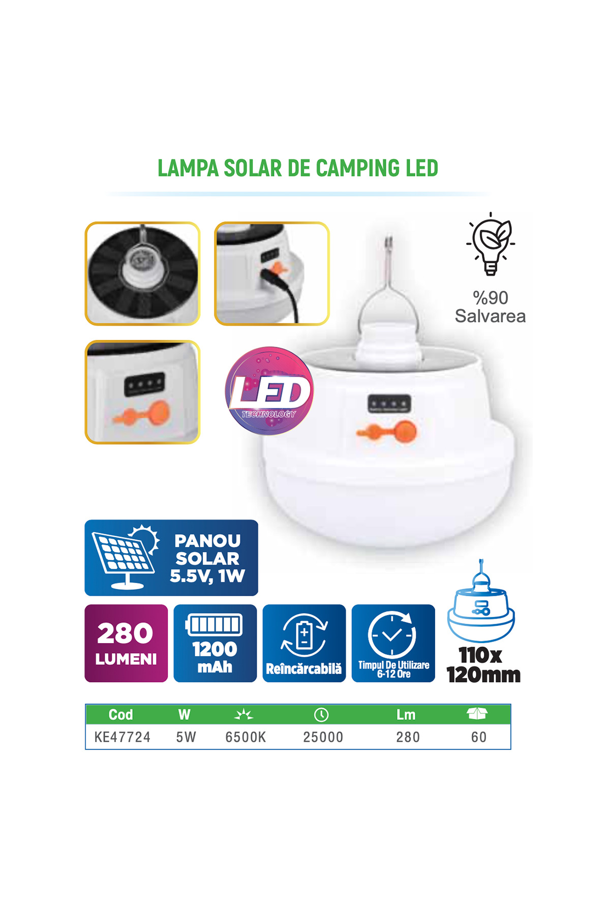 Panoul solar integrat reincarca acumulatorul pe parcursul zilei – iluminat gratuit seara fara acces la priză. Ideal camping in natura fara sursa de curent. La 280 lumeni, lampa ilumineaza un cort de 2-3 persoane sau o masa de camping complet.