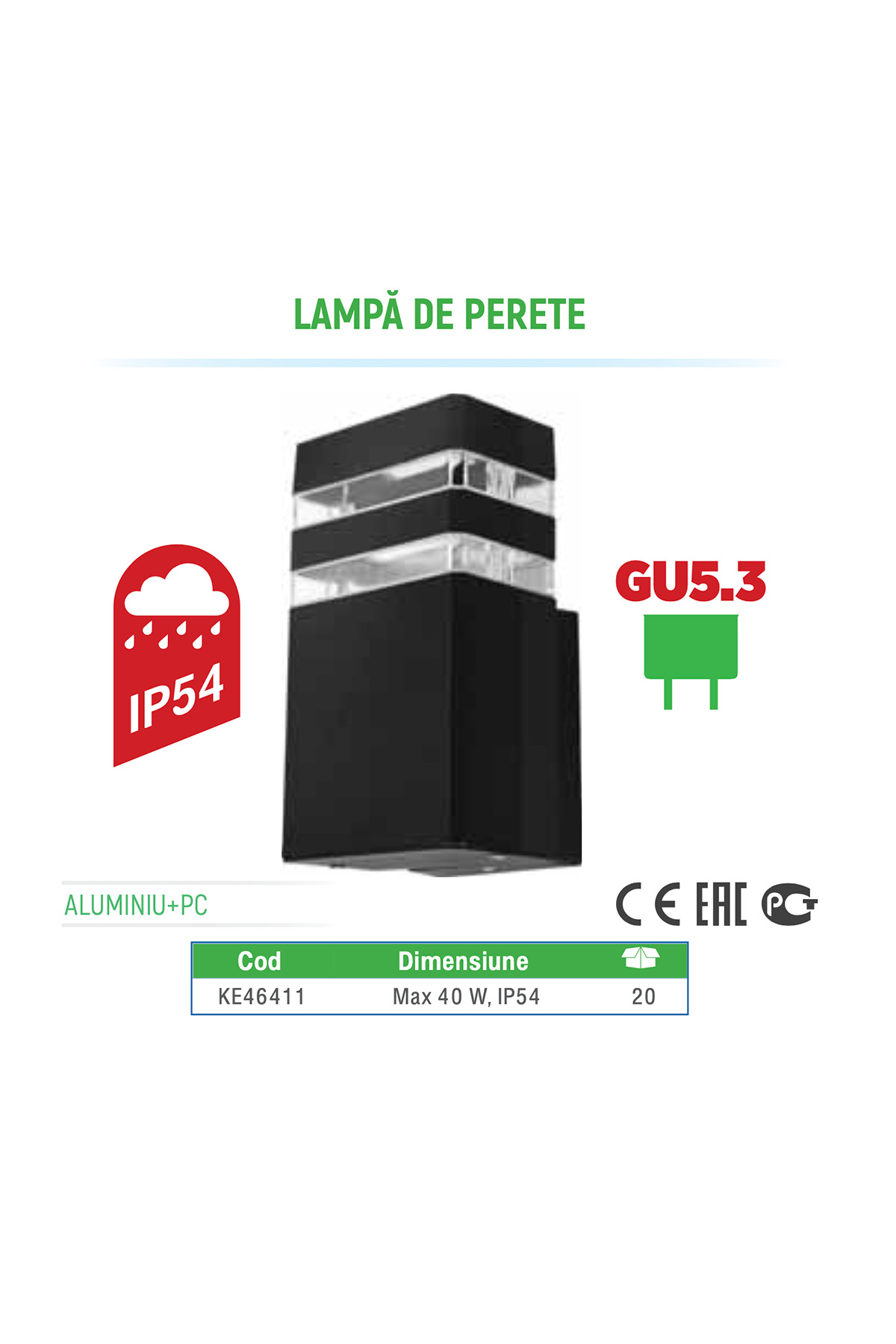 Aplica de perete Klaus, 1 soclu GU5.3, grad protecție IP54, culoare negru. Corp din aluminiu + policarbonat, dimensiuni 100x110x200mm. Iluminat unidirectional. Becuri GU5.3 NU sunt incluse.