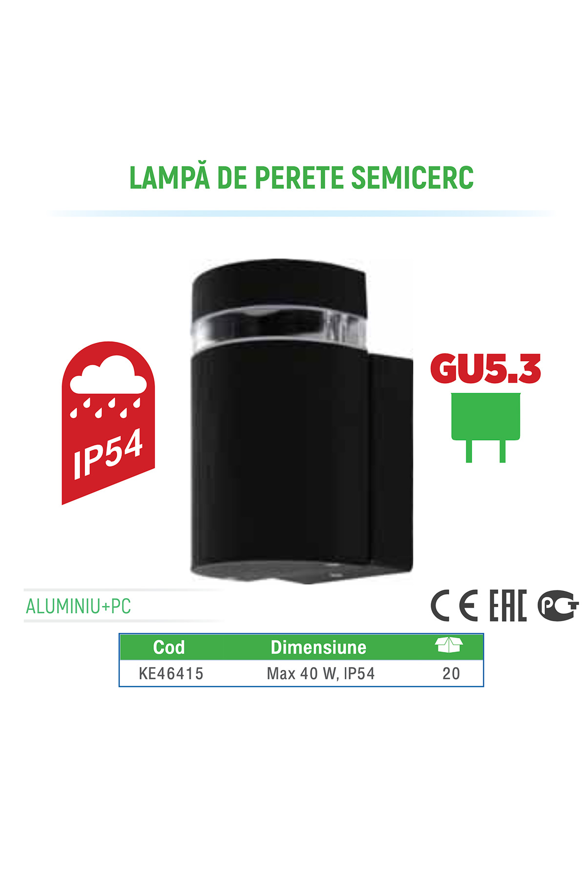 Aplica de perete Klaus, 1 soclu GU5.3, grad protecție IP54, culoare negru. Corp din aluminiu + policarbonat, dimensiuni 100x95x160mm. Iluminat unidirectional. Becuri GU5.3 NU sunt incluse.