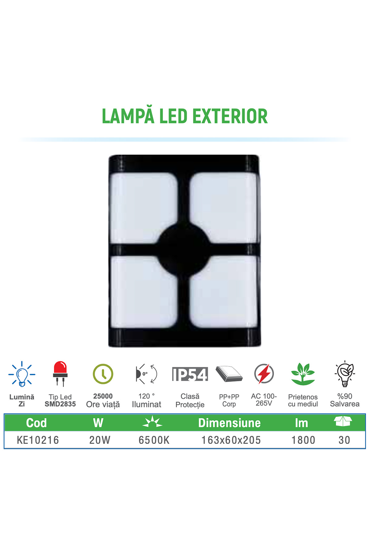 Aplică de perete Klaus 20W, eficiență 90 lm/W, LED integrat, grad protecție IP54. Corp PP, rezistent UV. Montaj exterior pe fațade, terase, intrări, scări. Rezistentă la ploaie, praf, variații -20°C la +40°C.