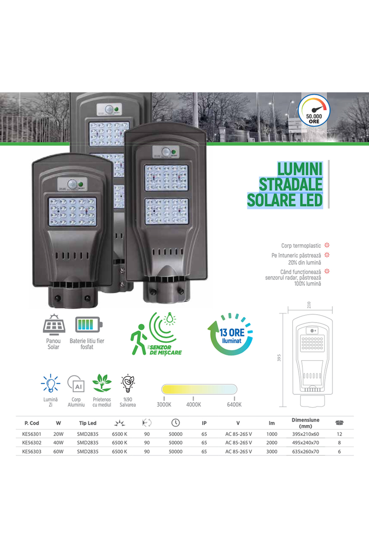 Zero cost de operare – energia vine de la soare, nu de la rețea. Nu necesita cablaj electric, sapatura, electrician – se monteaza oriunde exista lumina solara. Senzorul radar funcționează in 3 moduri: 1) Lumina slaba continua noaptea + intensitate maxima la miscare. 2) Intensitate maxima doar la miscare. 3) Lumina continua la intensitate medie. La 2000 lumeni, ilumineaza o zona de 50-100 m2.