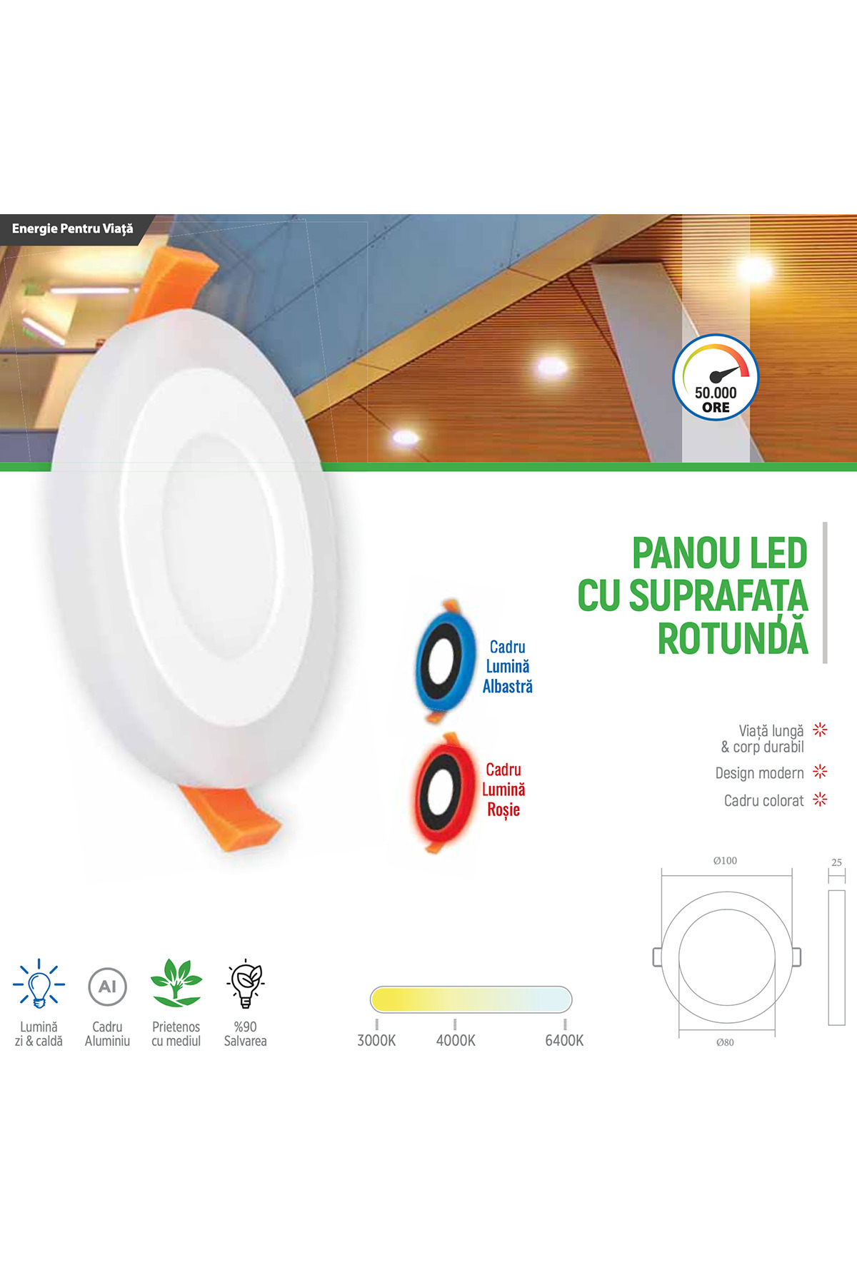 - CRI>80 — index de redare cromatică fidelă: culorile obiectelor arată natural, nu alterate