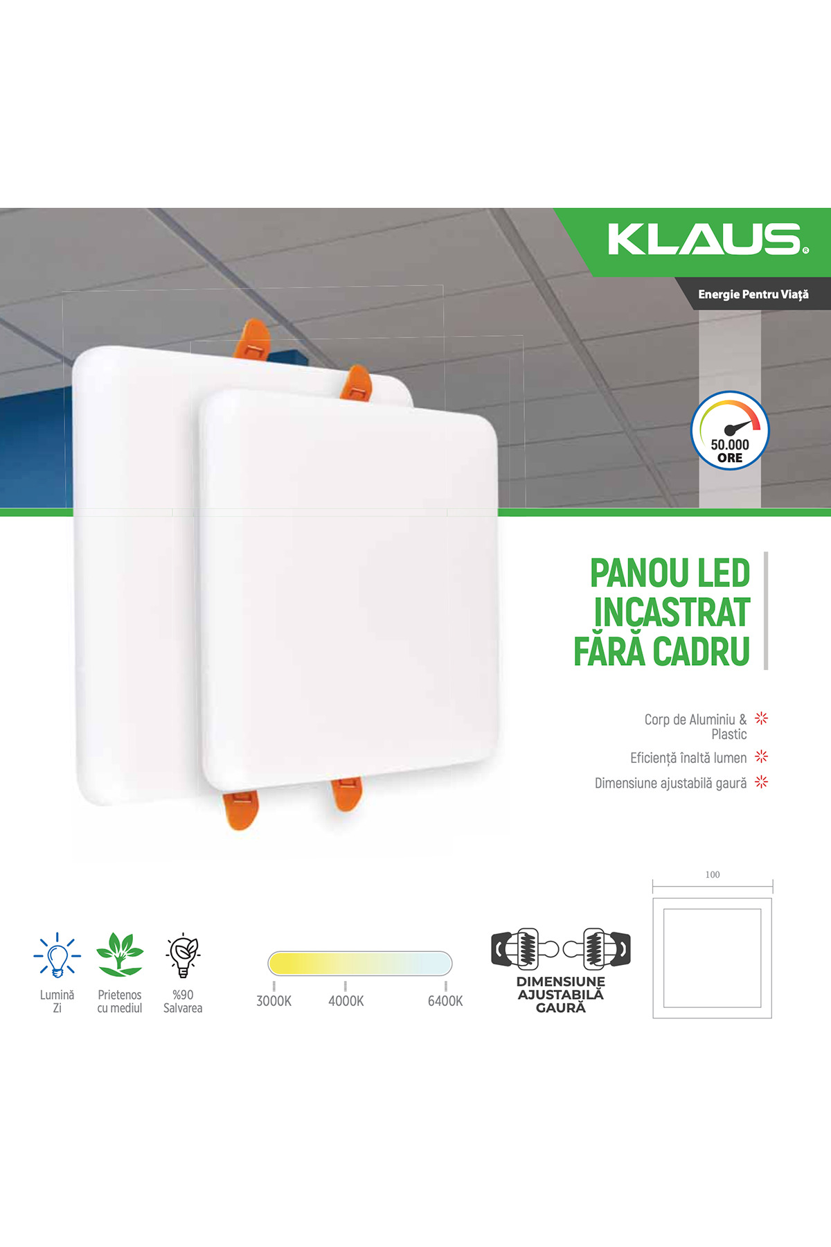 Panou LED pătrat Klaus 18W, 1260 lm (70.0 lm/W), alb neutru (4000K), montaj frameless. 36×SMD2835 LED-uri SMD 2835, CRI>80 (redare cromatică fidelă), unghi de radiație 120°. Gaura de montaj: 205×205 mm, dimensiune panou: 225×225×20 mm. Driver LED integrat cu curent constant, tensiune 85-265V AC 50/60Hz. Grad protecție IP20, durată viață 30.000 ore. Material: aluminiu turnat sub presiune + difuzor PC opalizat. Fără mercur, fără UV. Certificări CE, RoHS.