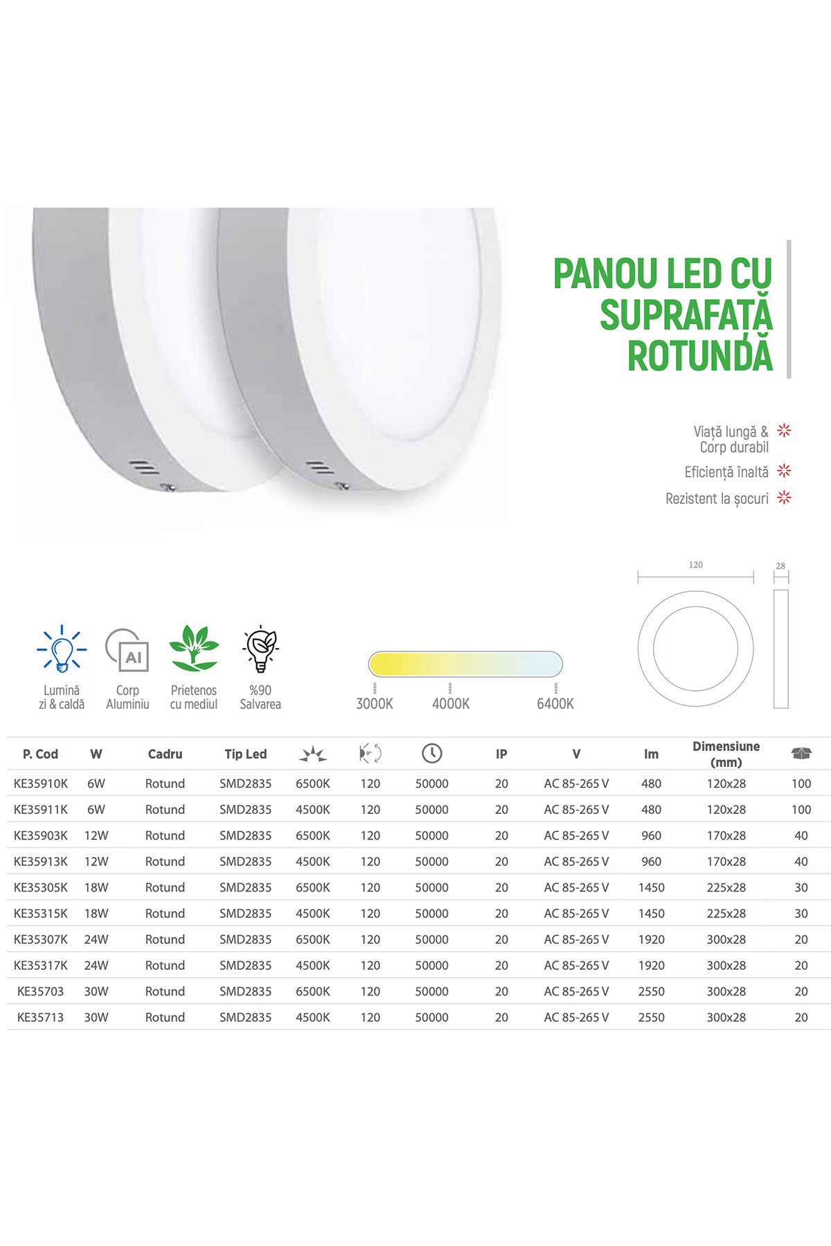• Unghi de radiație 120° — distribuție uniformă a luminii fără zone întunecate sau hot-spots