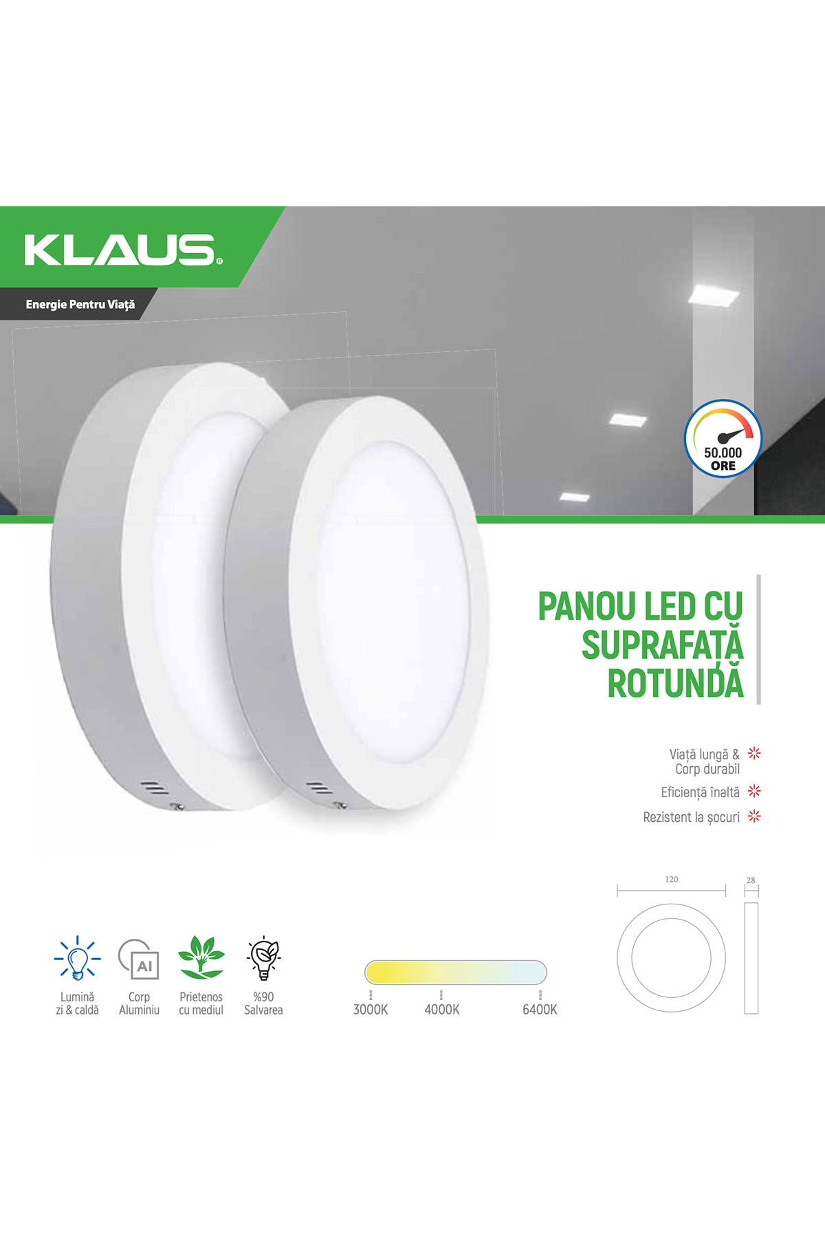 Panou LED rotund Klaus 18W, 1450 lm (80.6 lm/W), alb neutru (4000K), montaj încastrat. 36×SMD2835 LED-uri SMD 2835, CRI>80 (redare cromatică fidelă), unghi de radiație 120°. Gaura de montaj: Ø205 mm, dimensiune panou: Ø225 mm. Driver LED integrat cu curent constant, tensiune 85-265V AC 50/60Hz. Grad protecție IP20, durată viață 30.000 ore. Material: aluminiu turnat sub presiune + difuzor PC opalizat. Fără mercur, fără UV. Certificări CE, RoHS.