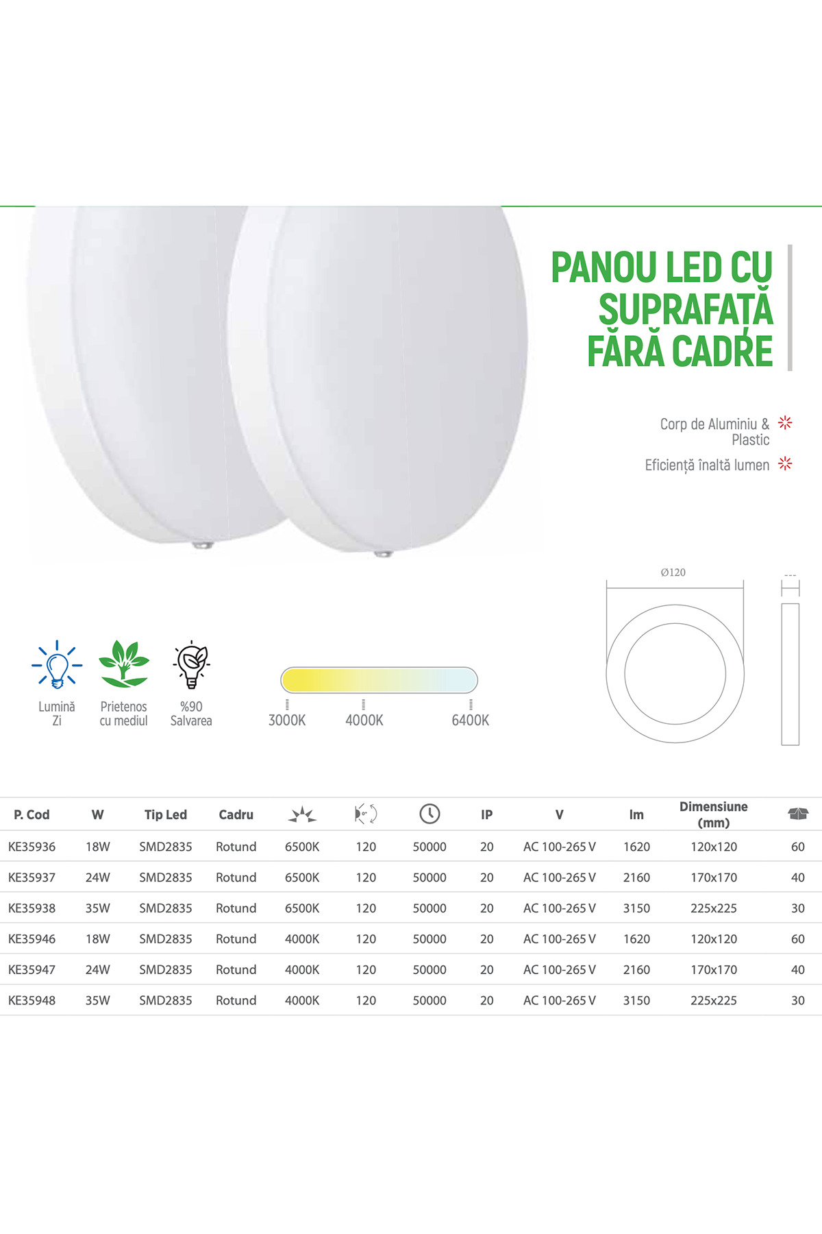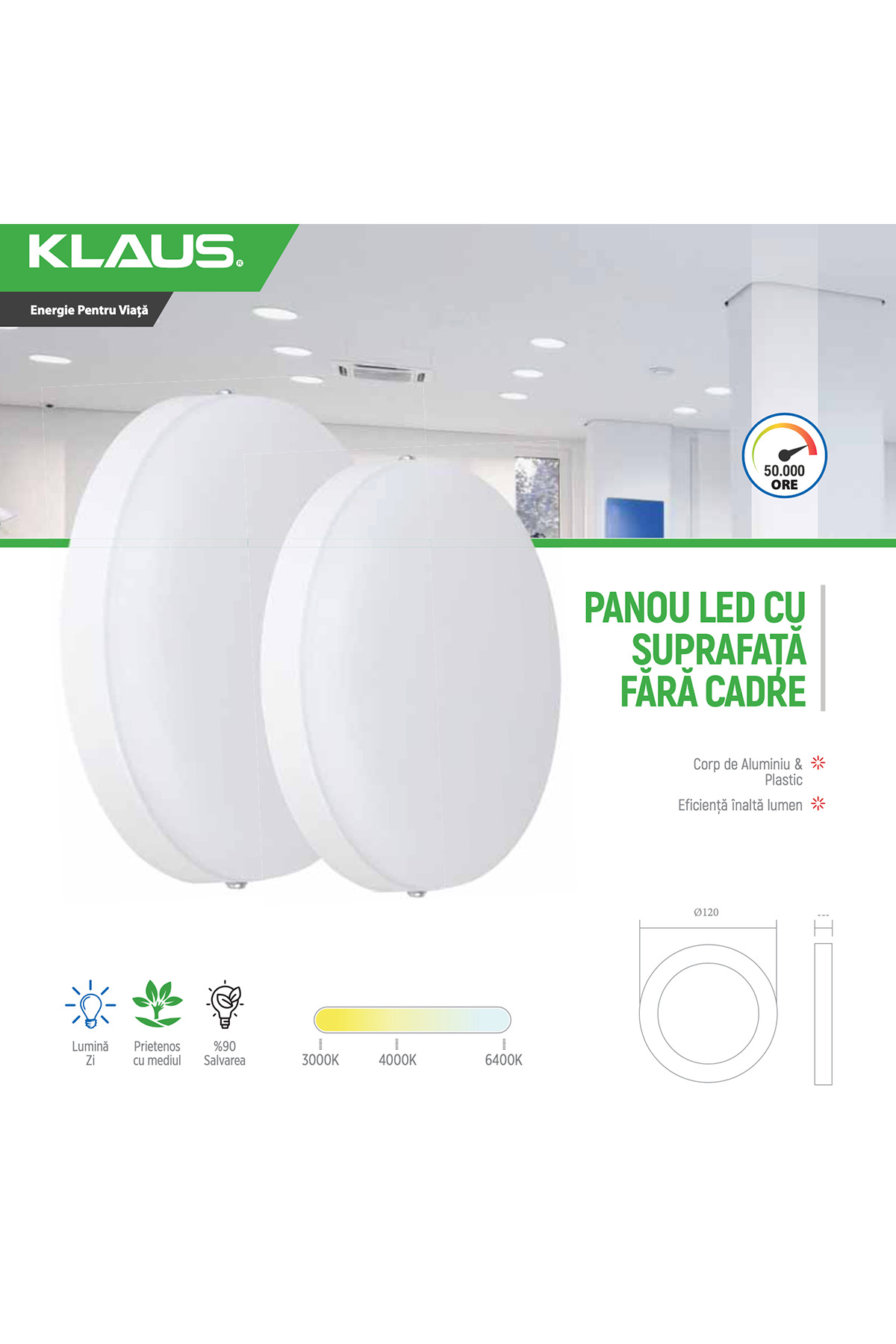 Panou LED rotund Klaus 24W, 1680 lm (70.0 lm/W), alb neutru (4000K), montaj frameless. 48×SMD2835 LED-uri SMD 2835, CRI>80 (redare cromatică fidelă), unghi de radiație 120°. Gaura de montaj: Ø285 mm, dimensiune panou: Ø300 mm. Driver LED integrat cu curent constant, tensiune 85-265V AC 50/60Hz. Grad protecție IP20, durată viață 30.000 ore. Material: aluminiu turnat sub presiune + difuzor PC opalizat. Fără mercur, fără UV. Certificări CE, RoHS.
