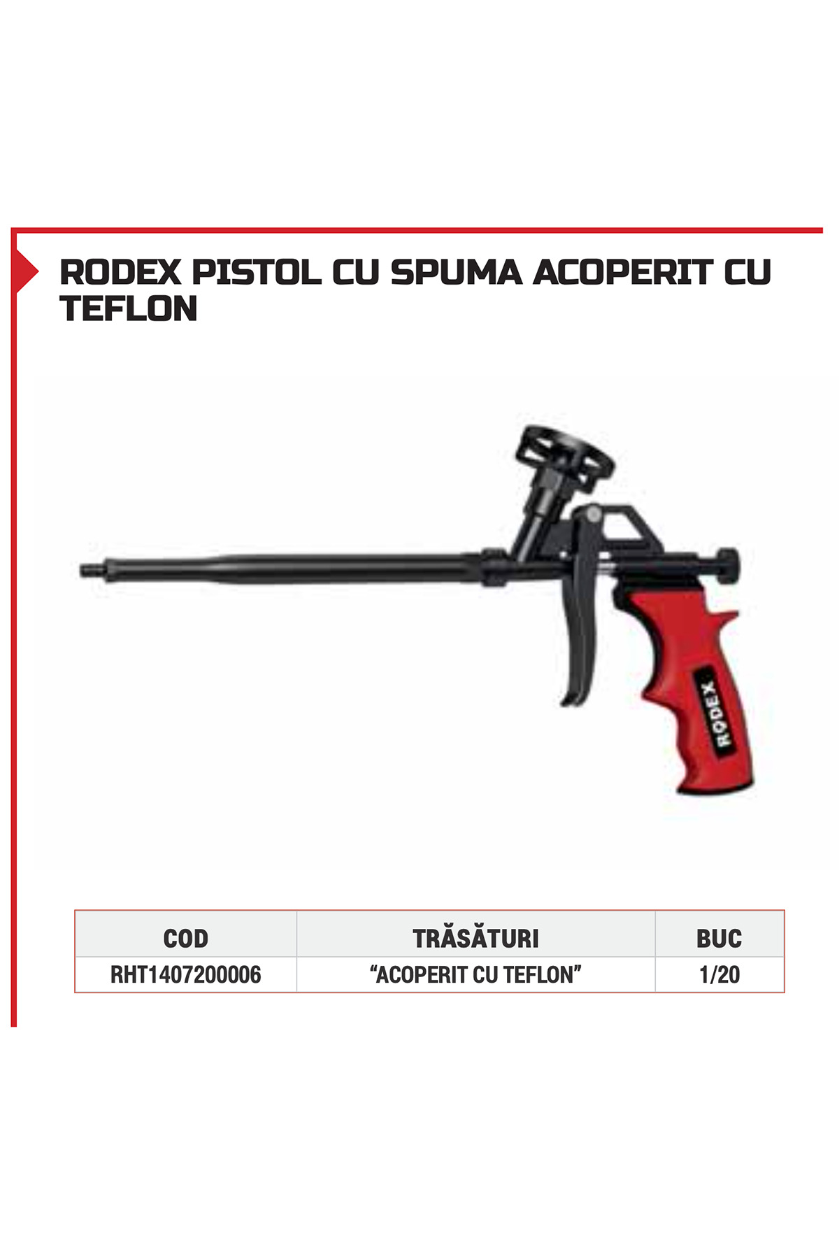 Pistol pentru spumă poliuretanică cu acoperire Teflon — spuma nu se lipește de corp, curățare instantanee fără solvent. Declanșator cu reglaj permite aplicare de la fir subțire (2 mm) la bandă lată (30 mm). Compatibil cu toate tuburile de spumă standard.
